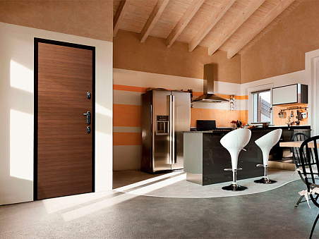 Входная распашная дверь с сейфовым и цилиндровым замком. Имеет повышенный уровень безопасности, шумоизоляцию и защиту от сквозняков. Отделка панелями из натурального шпона.