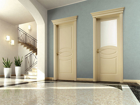 Межкомнатные двери из шпона натурального дерева в Бежевом оттенке, лакированные: модель D3E CIECA с глухим полотном  и модель D3E VETRO со стеклянной вставкой с декором, нанесенным методом пескоструйной обработки. Наличники с резной капителью. Ручки Venere на круглой розетке от Olivari. Комплектуются коробом и петлями.