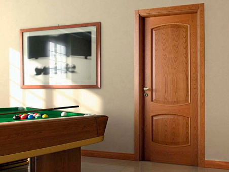 Распашная дверь для внутренних пространств из шпона натурального дерева, глухое полотно с декором, цвет – Вишня. Оснащена ручкой Perla от Olivari. Модель поставляется с коробом, наличниками и петлями.
