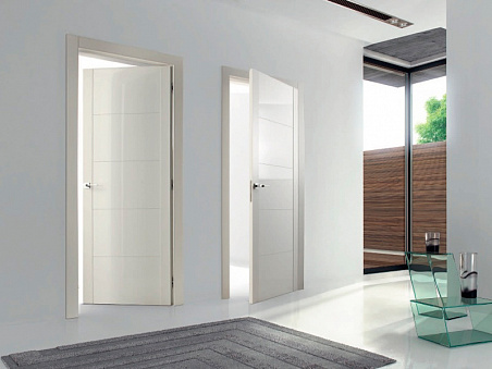 Белая, межкомнатная, распашная дверь  со вставкой из синтетического полимера Метакрилата (Metacrilato), который обладает устойчивостью к старению. Крашенная; изготовлена из натуральной древесины. Полотно с горизонтальным декором. Оснащена ручкой Adamant на квадратной розетке, фабрика Olivari. Плоские наличники, короб и петли входят в комплект.