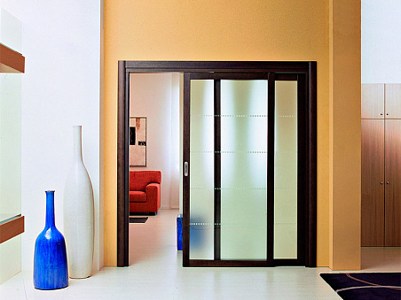 Откатная дверь для внутренних помещений  со встроенной системой скольжения. Изготовлена  из натурального шпона. Рама и наличники – Дуб Венге. Полотно из светлого матового стекла с гравировкой. Модель помогает грамотно организовать пространство и значительно сэкономить площадь. Оснащена ручкой Scivola от AGB.