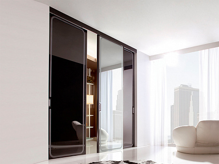 Система раздвижных межкомнатных дверей. Боковые полотна, украшенные по краям декором в виде петли, изготовлены из стекла глубокого черного оттенка, центральное – серебряное зеркало. Профили изготовлены из лакированного Ясеня и окрашены с применением метода открытопористой покраски. Поставляется в комплекте с замком AGB.