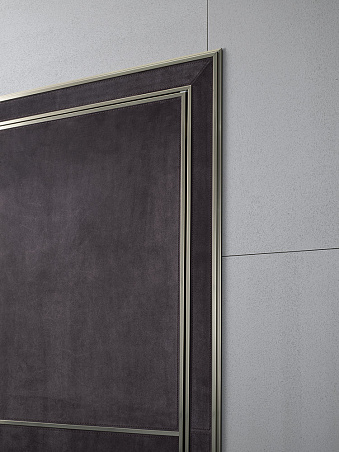 Фрагмент межкомнатной распашной двери BeMine.  Профиль - Champagne Bright Gold Alluminium, отделка полотна и наличников - замша.   Замшевые элементы имеют декоративную отстрочку по периметру.