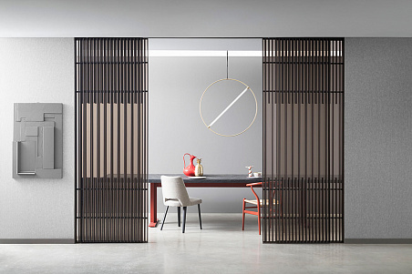 М/к перегородка Koan. Используемые материалы: алюминий, стекло, дерево.