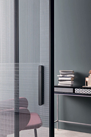 Фрагмент м/к перегородки L7 с одной створкой. Профиль - черный (анодированный алюминий NERO), стекло - Marks.
