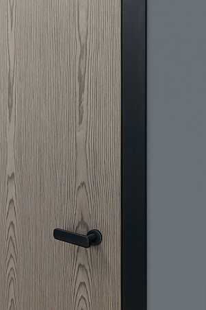 Фрагмент м/к двери L7 large, демонстрирующий сочетание черного анодированного алюминия на раме и ручке со шпоном дуба на полотне.