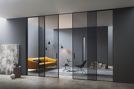 М/к перегородка Shoin. Четыре полотна на двухрельсоввой скрытой направляющей. Стекло одинарное, тонированное, располагается вровень с внешним алюминиевым контуром. Ручки встроенные.