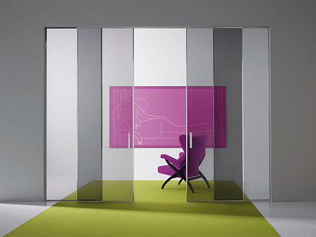 Скользящая система дверей и перегородок из стекла в тонкой алюминиевой раме. Позволяет создавать настоящие помещения, стеклянные короба либо зонировать пространства. Полотна фиксируются на одном или двух рельсах, оснащенных системой торможения и механизмом регулировки высоты. Модель подходит для конфигурации с раздвижными и неподвижными панелями. Комплектуется ручкой.