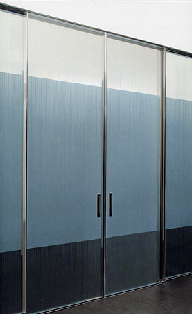 Скользящая система дверей для внутренних помещений. Изготавливается из стекла или дерева с многослойной структурой, вставленных в тонкую алюминиевую раму. Модель фиксируется на одном или двух рельсах, имеющих систему торможения и каретку с механизмом регулировки высоты. В комплектацию входит ручка.