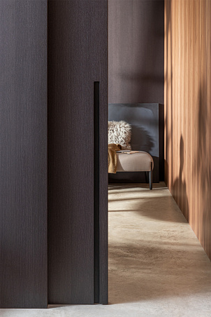Sliding 50 из дуба мока, интегрированный с системой Wall&Door. Стена с отделкой орех каналетто.