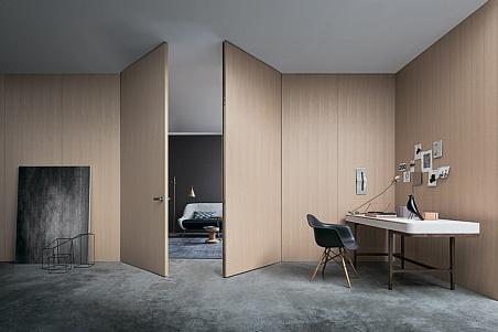 Система со стеновыми панелями Wall&Door. Дверь, интегрированная в систему панелей, может быть как одностворчатой, так и двустворчатой.