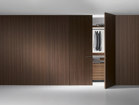 Система со стеновыми панелями Wall&Door. Фиксированные шпонированные створки со встроенной двустворчатой дверью отгораживают гардеробную от жилого пространства.