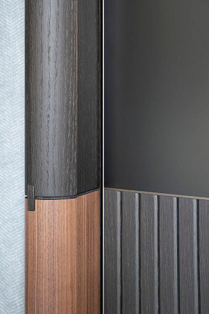 Фрагмент м/к двери Ying, демонстрирующий различные элементы на раме и полотне, а также сочетание различных отделок, текстур и фактур в рамках одной двери.