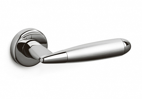 Нажимная дверная ручка в отделке – Глянцевая латунь, со вставкой из Сатинированной латуни. На круглой розетке. Модель разработана собственным исследовательским бюро компании Olivari. Предлагается в различных отделках.