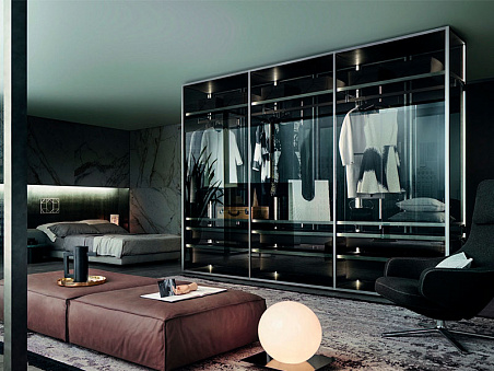 Отдельно стоящая композиция с алюминиевой структурой piombo spazzolato, створки, боковины и задняя стенка из прозрачного серого стекла. Cover freestanding – это система шкафов с алюминиевой рамой, стеклянными дверцами, боковыми панелями и задней стенкой. С ее помощью можно удовлетворить любые функциональные и дизайнерские потребности современного интерьера, система позволяет составлять идеально подогнанные прямые или угловые композиции со встроенным доступом к гардеробной или служебной зоне. Разнообразие вариантов стеклянной отделки из коллекции Rimadesio дает возможность формировать эстетически разноплановые конфигурации: от абсолютно прозрачных «витрин» до традиционных платяных шкафов с дверцами из матового или глянцевого лакированного стекла в сочетании с прозрачными или матированными боковинами и задними стенками, достигая тем самым естественной освещенности интерьера.