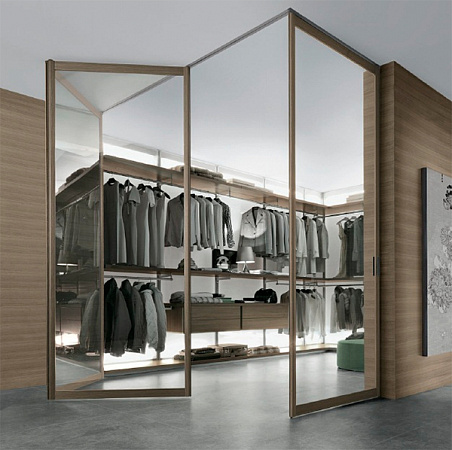 Итальянские двери / Бренды / Rimadesio / Dress Bold / Гардеробная из алюминия и стекла и шпонированная перегородка со стеклом siparium Dress Bold Rimadesio