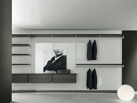 Итальянские двери / Бренды / Rimadesio / Dress Bold / Гардеробная со стеклянными стеновыми панелями подвесными ящиками и полками из меламина Dress Bold Rimadesio