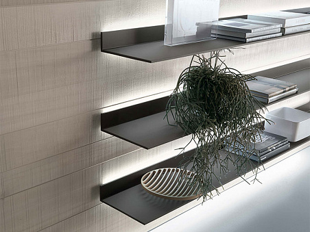 Подвесные полки с подсветкой - алюминиевая структура, топ из матового лакированного стекла caffe. Конструкция EOS - это система настенных полок толщиной 8 мм со стеклянной поверхностью и алюминиевым основанием. Она сочетает эстетическое разнообразие и максимальную надежность. Инновационный метод настенного крепления обеспечивает монтаж без выступающих винтов с возможностью светодиодного освещения.