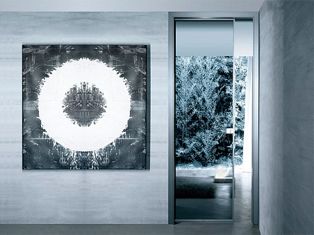Раздвижная дверь с алюминиевой рамой, стекло riflettente grigio. Дверь Spin имеет эксклюзивный дизайн, отражающий новейший подход к созданию запирающих механизмов. Эта дверь оснащена запатентованным магнитным замком Rimadesio, делающим момент закрывания плавным и бесшумным. Основная суть конструкции Spin кроется в продуманной эстетической концепции, которая становится частью всех элементов коллекции. Главной особенностью модели выступает дверная ручка, дизайн которой содержит определенные элементы рационализма. Конструкция также, как и другие модели дверей Rimadesio, содержит скрытые двусторонние петли, позволяющие легко поменять левое открывание на правое, гарантируя при этом минимальные сроки сборки. Эксклюзивные телескопические наличники из алюминия позволяют компенсировать разницу в толщине стен.
