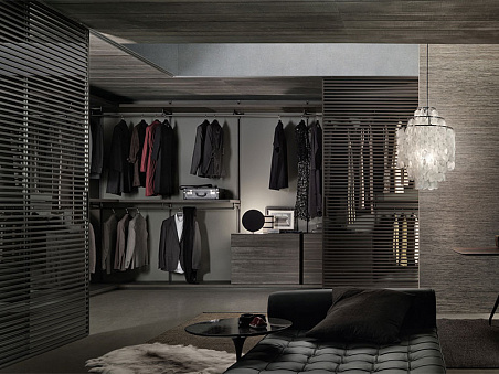 Перегородка алюминий+стекло, гардеробная-алюминий+стекло+меламин. Stripe – это система раздвижных панелей, отличительной особенностью которых являются алюминиевые поперечные вставки по обеим сторонам стекла, из-за которых композиция приобретает идеальный двусторонний вид. Stripe подходит как для гостиных, спален, гардеробных, кухни, может использоваться для зонирования пространства, например, отделения рабочей зоны от зоны общения. При помощи раздвижных панелей Stripe направление света становится ключевым элементом в интерьере, позволяя подчеркивать те или иные детали, создавая определенное настроение, а высокое качество и технологичность перегородок позволяют манипулировать пространством легко и бесшумно.