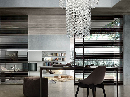 Коричневая алюминиевая рама, со стеклом trasparente grigio. Stripe – это система раздвижных панелей, отличительной особенностью которых являются алюминиевые поперечные вставки по обеим сторонам стекла, из-за которых композиция приобретает идеальный двусторонний вид. Stripe подходит как для гостиных, спален, гардеробных, кухни, может использоваться для зонирования пространства, например, отделения рабочей зоны от зоны общения. При помощи раздвижных панелей Stripe направление света становится ключевым элементом в интерьере, позволяя подчеркивать те или иные детали, создавая определенное настроение, а высокое качество и технологичность перегородок позволяют манипулировать пространством легко и бесшумно.
