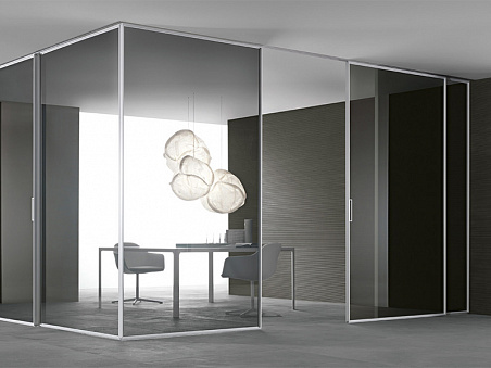 Алюминиевая рама, со стеклом trasparente grigio. Эту модель раздвижных перегородок смело можно назвать панелями с максимальной геометрической точностью. Полотна изготавливаются по индивидуальным размерам заказчика из несущего алюминиевого профиля минимальной толщины, благодаря которому эксклюзивная эстетика стекла Rimadesio обретает легкость и изящность. Система оснащена запатентованными техническими компонентами, которые гарантируют практически полную свободу дизайнерских решений в сочетании с удобством монтажа и исключительной надежностью в течение долгих лет.