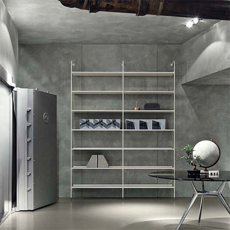 Система хранения-алюминий+стекло, стол-алюминий+стекло. Wind – это архетип книжного шкафа в новой интерпретации от Rimadesio: модульная система, сочетающая в себе эстетическую легкость и технологические инновации. В основу проекта, в котором использован только алюминий, положена композиция из экструдированных полок и литых под давлением направляющих, расположенных по центру и по краям, которые за счет своей эксклюзивной конструкции определяют эстетику системы. Вертикальная модульность Wind реализована посредством сочленений на основе нейлонового волокна, вставленного в вертикальные направляющие, за счет чего достигается максимальная устойчивость. Завершающим элементом каждой композиции является многослойная лакированная верхняя панель из МДФ с двойной алюминиевой пластиной.